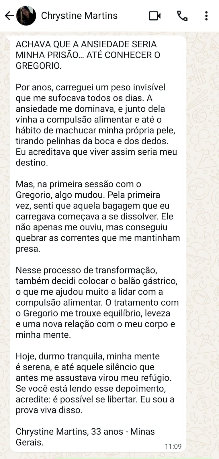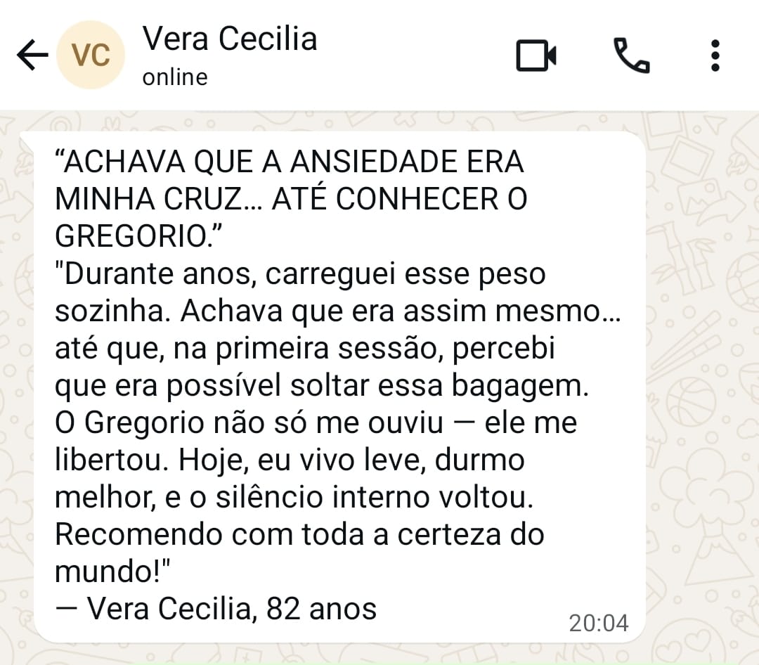 Nesse encontro, vou ouvir sua história, compreender suas dores e bloqueios, e você abre o caminho para a transformação merecida. Você dá o primeiro passo para retomar o controle da sua vida.